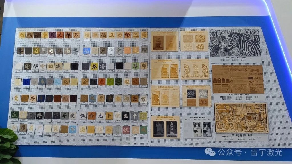 材料研究:该区域以百家姓为载体,主要展示了雷宇激光的激光雕刻机、打标机能够加工的材料及使用工艺。墙上每个姓氏为1种材料,总共展示112种生活中比较常见的材料,包括木材、金属、塑料、布料、皮革、石材、纸张7大类。