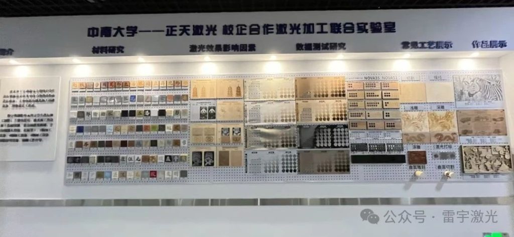 从左至右,本工艺墙共分为三大版块:材料研究、激光效果影响因素、及激光作品展示。