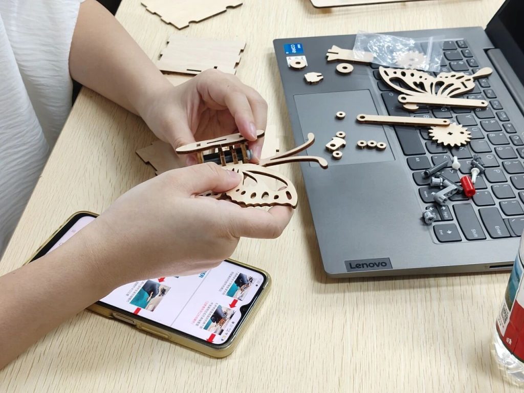 陈老师系统讲解了激光的知识科普、LaserMaker激光建模软件应用,以及激光设备操作与安全规范等,为学员们的实操体验筑牢基础。 他还引入了AI生图平台作为创意辅助工具,展示了如何通过关键词生成极简线条图,并快速转化为激光可加工的设计图纸。这一环节体现了“数智赋能”在STEAM教育中的前沿应用,为学员们提供了新的课程设计思路。 工作坊的核心环节是“仿生蝴蝶” 的制作与微创新。 现场学员在动手组装齿轮、连杆与翅膀结构的过程中,不仅理解了机械传动原理,更亲身感受到激光技术如何将数字化设计快速转化为实物。当一只只蝴蝶在组装完成后振翅起舞,课堂充满了创造实现的兴奋与成就感。